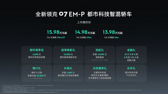 全新領克07EM-P上市即交付,錨定15萬級電混轎車價值新高度。即日起,用戶通過領克APP、小程序等官方平臺即可訂購全新領克07EM-P。