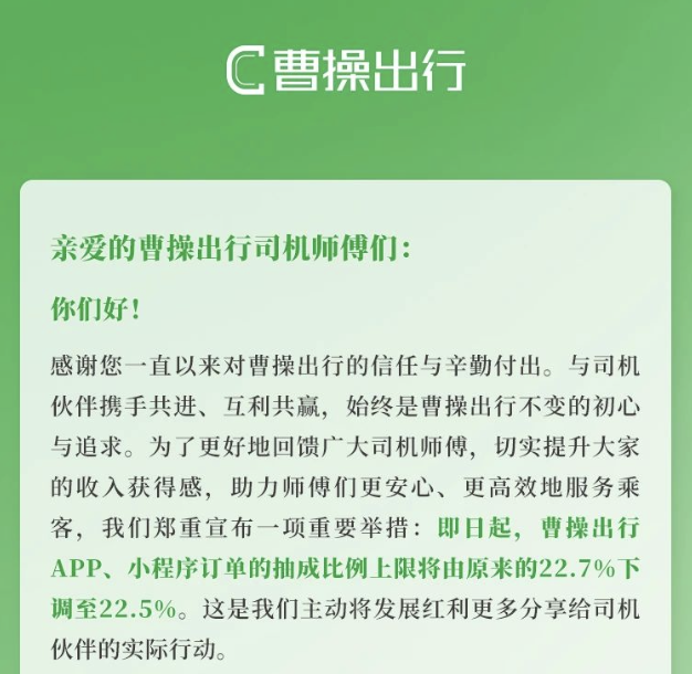 曹操出行則表示,將APP、小程序訂單的抽成比例上限將由原來的22.7%下調(diào)至22.5%,“這是我們主動將發(fā)展紅利更多分享給司機伙伴的實際行動”。