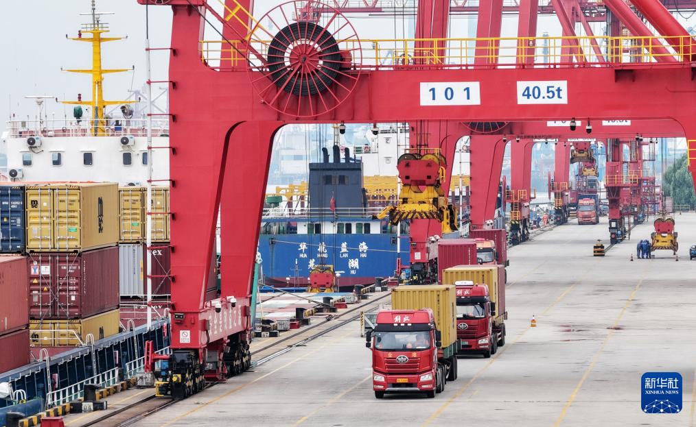 9月8日,在山東港口集團青島港,一艘裝載外貿(mào)集裝箱的貨輪駛離泊位(無人機照片)。
