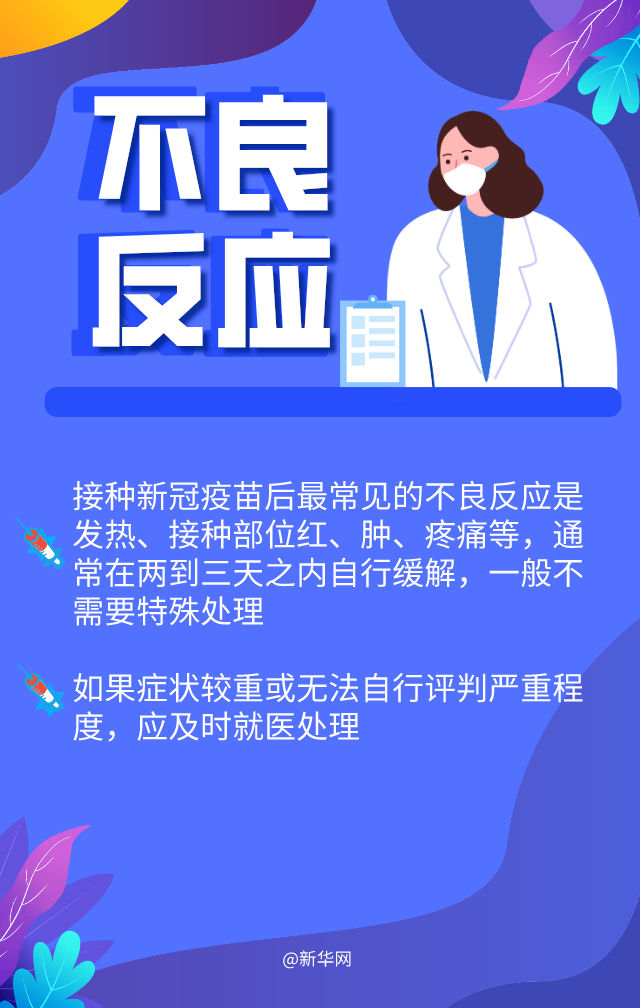 根據新冠病毒滅活疫苗接種知情同意書,局部不良反應以接種部位疼痛為主,還包括局部瘙癢、腫脹、硬結和紅暈等,全身不良反應以疲勞乏力為主,還包括發熱、肌肉痛、頭痛、咳嗽、腹瀉、惡心、厭食和過敏等。