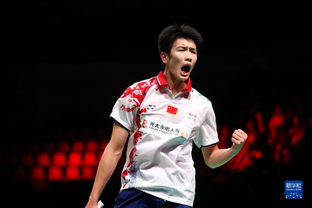 10月17日,中國隊選手李詩灃在在男單比賽中慶祝得分,他以1比2不敵印尼隊選手喬納坦·克里斯蒂。