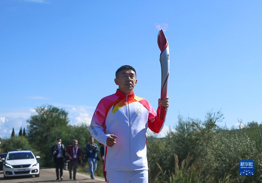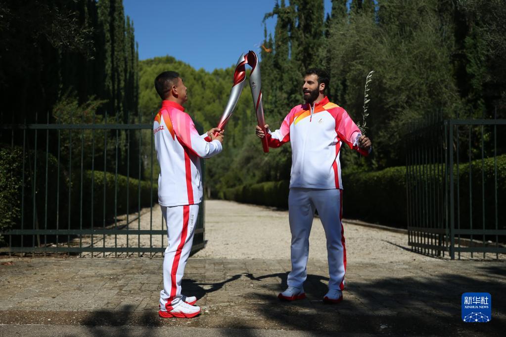 10月18日,希臘高山滑雪運動員揚尼斯·安東尼烏(右)將火種傳遞給第二名火炬手——前中國短道速滑運動員李佳軍。