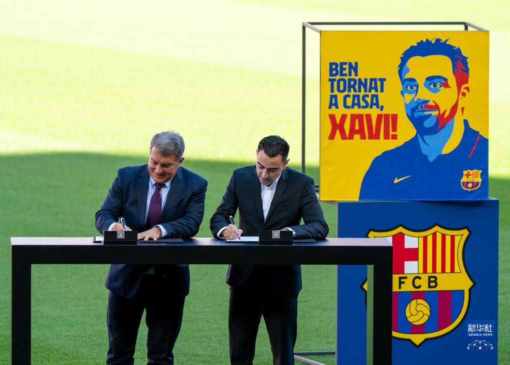 11月8日,哈維(右)與巴塞羅那俱樂部主席拉波爾塔在諾坎普球場簽署協議。