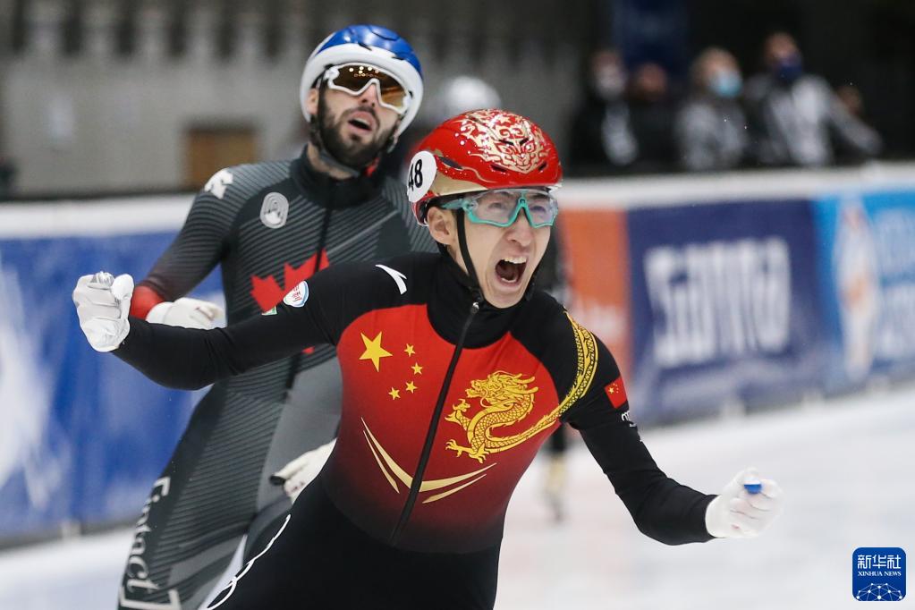 11月27日,中國選手武大靖(前)奪冠后慶祝。