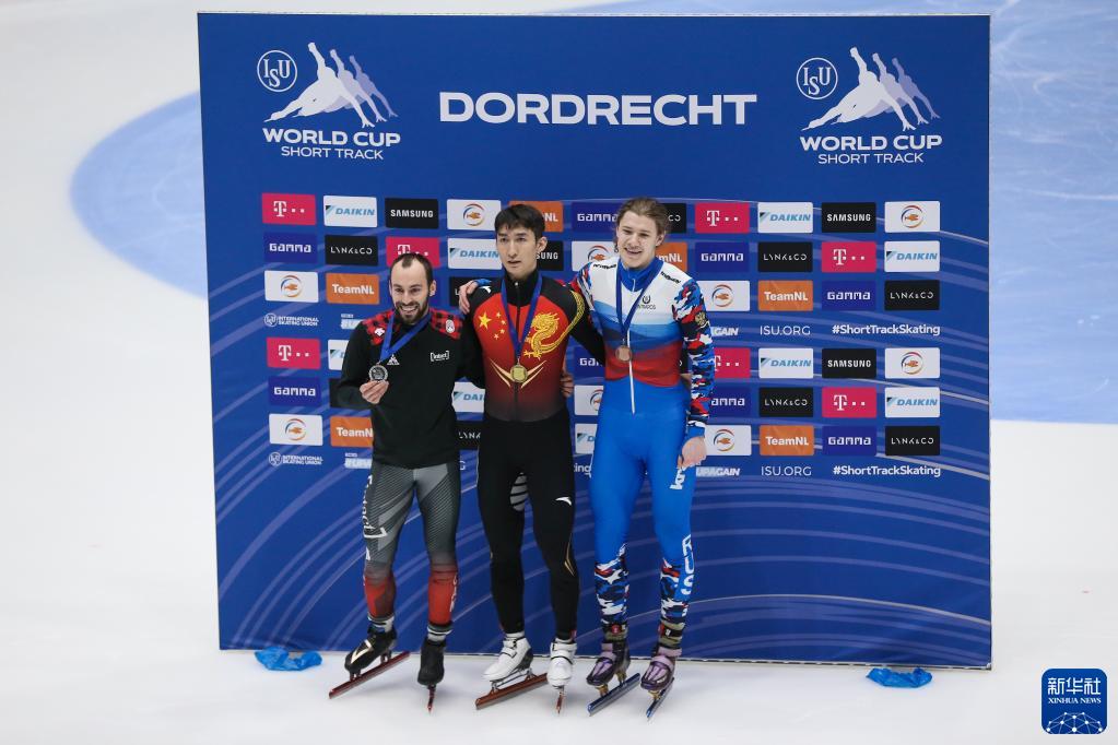 11月27日,冠軍中國選手武大靖(中)、亞軍加拿大選手杜波瓦(左)和季軍俄羅斯選手伊夫列夫在頒獎儀式上。
