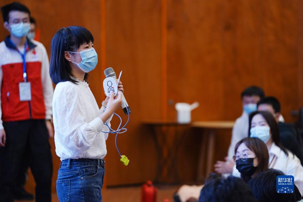 11月28日,清華大學醫院醫生李晶鈴(前)在為學生志愿者講授自動除顫器的使用方法。