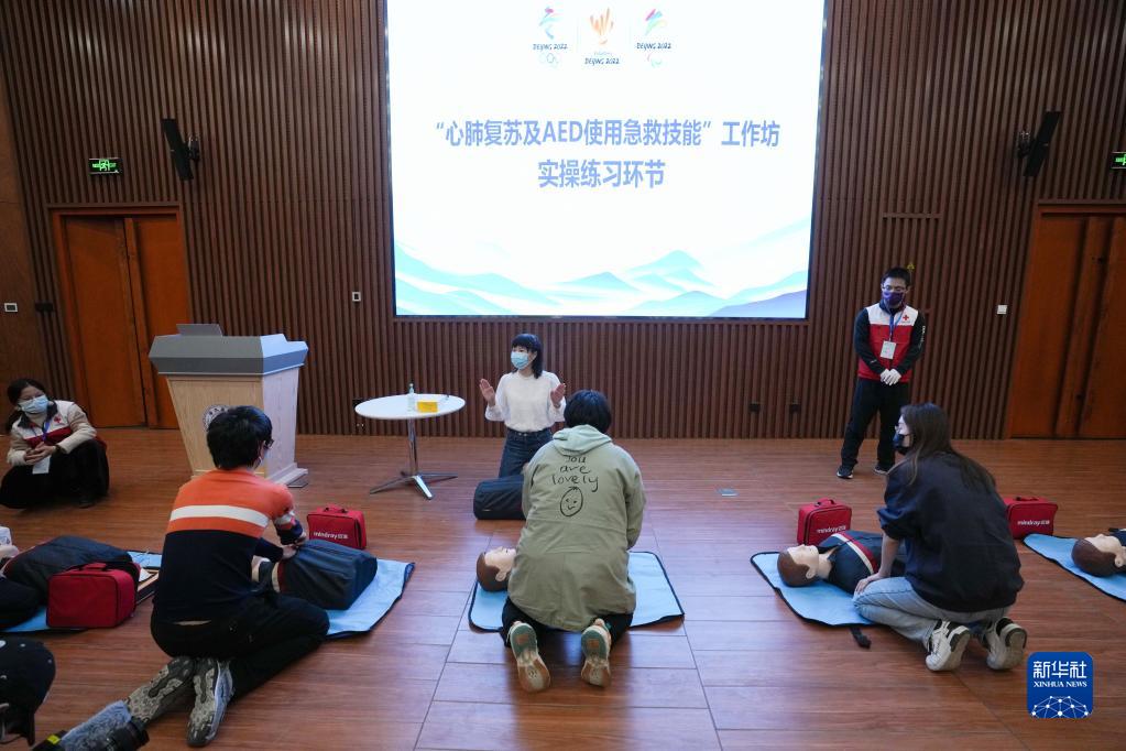 當日,清華大學舉辦面向冬奧學生志愿者的“心肺復蘇及AED使用急救技能”工作坊,由清華大學醫院醫生對學生志愿者進行心肺復蘇術、自動除顫器(AED)使用等基本急救技能的講授與培訓。