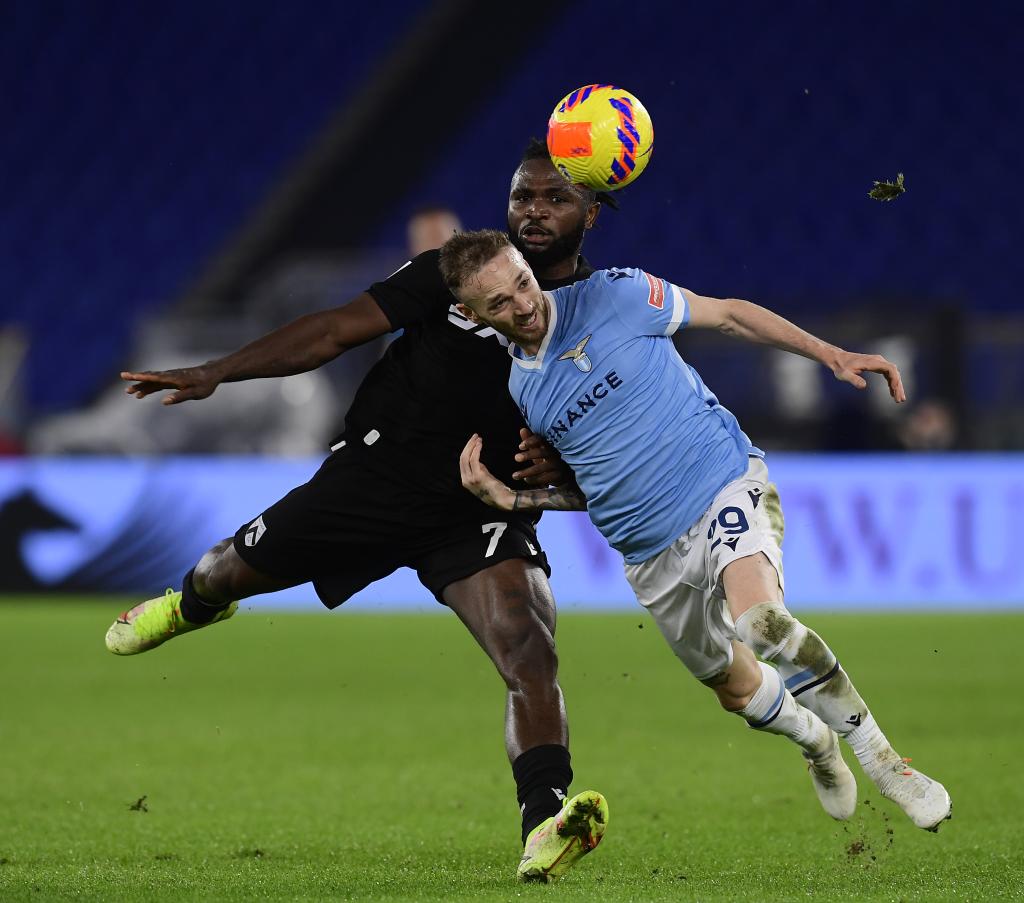 12月2日,拉齊奧隊球員拉扎里(右)與烏迪內斯隊球員蘇克塞斯在比賽中拼搶。