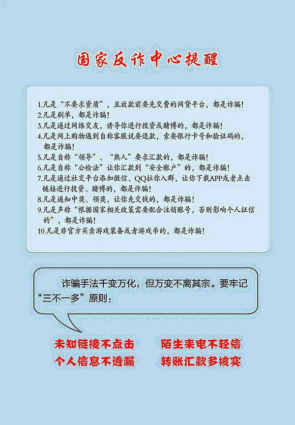電信網絡詐騙手法千變萬化,但萬變不離其宗,記住“三不一多”原則: