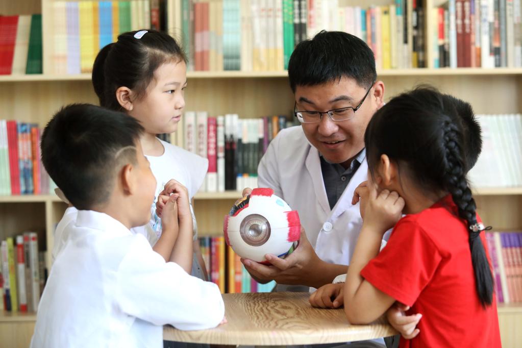 在石家莊市橋西區(qū)振頭街道一個社區(qū),眼科機構(gòu)工作人員在為社區(qū)兒童講解眼科知識。新華社發(fā)(梁子棟 攝)