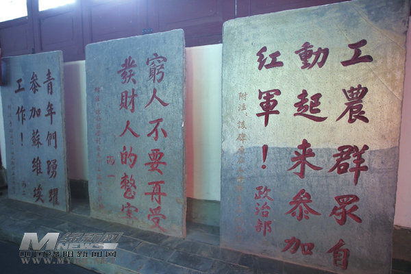 《綿陽紅軍石刻碑林》中介紹,紅軍在綿陽期間,大力開展政治宣傳工作。其中,用石刻標語進行宣傳是紅四方面軍的一大創舉。紅軍鏨字隊和各地蘇維埃政府組織的石工,按照紅軍規定的宣傳內容,在涪江兩岸廣大赤區的城鎮鄉村、住宅院落、交通要道、關津渡口、橋梁、懸崖絕壁處,鏨刻了大量的紅軍宣傳標語。