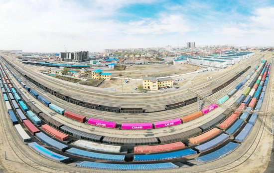 二連浩特鐵路口岸待出境的中歐班列運輸集裝箱