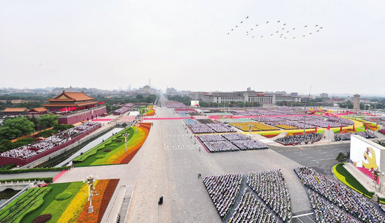 7月1日,慶祝中國共產黨成立100周年大會在北京天安門廣場隆重舉行。這是大會開始前的飛行慶祝表演。(新華社記者 李賀 攝)