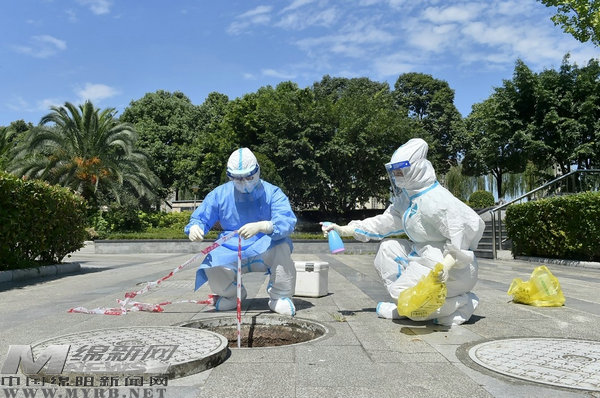 7月30日下午,五一廣場在太陽的炙烤下悶熱難耐。涪城區疾控中心的周彪和熊艷再一次穿上了密不透風的防護服,這里隔離著此次確診患者的密接和次密接人員,每天一次的核酸檢測雷打不動。對隔離人員采樣結束后,兩人又來到污水口,打開污水蓋,提取污水采樣。“不僅要關注隔離人群的情況,每天還要對他們的生活環境進行采樣。”熊艷告訴記者。