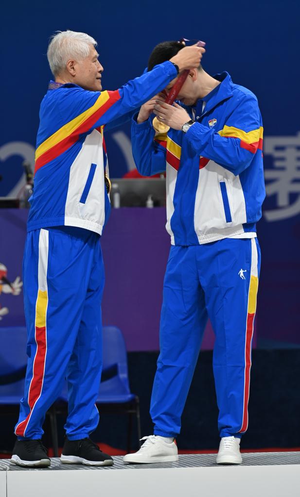 9月26日,遼寧隊(duì)領(lǐng)隊(duì)蔣興權(quán)(左)給遼寧隊(duì)主教練楊鳴佩戴金牌。