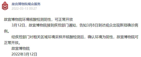 經疾控部門對相關區域環境采樣并核酸檢測后,確認環境為陰性,故宮博物院可正常開放。