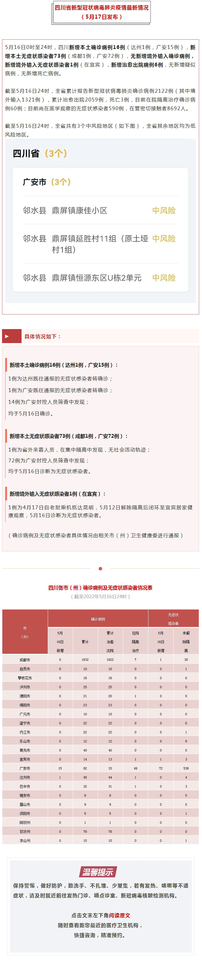5月16日0時至24時,四川新增本土確診病例16例(達州1例,廣安15例),新增本土無癥狀感染者73例(成都1例,廣安72例),無新增境外輸入確診病例,新增境外輸入無癥狀感染者1例(在宜賓),新增治愈出院病例6例,無新增疑似病例,無新增死亡病例。