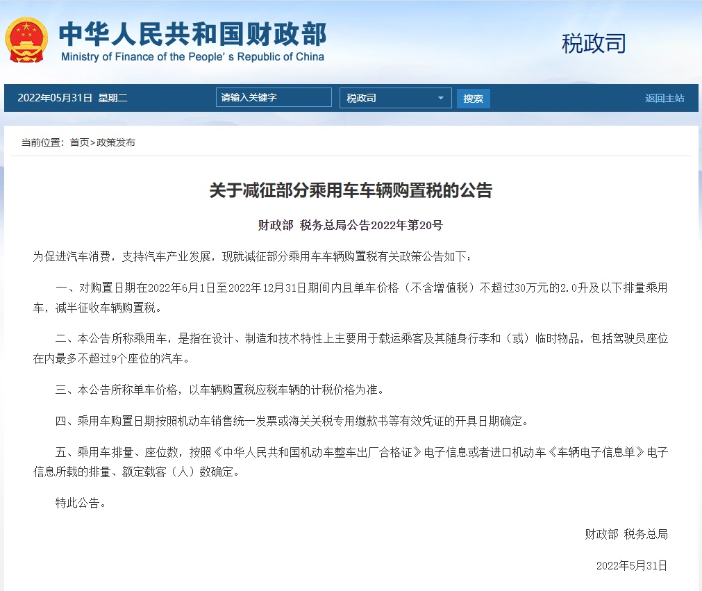 5月31日,財政部、稅務總局聯合發(fā)布“關于減征部分乘用車車輛購置稅的公告”,為促進汽車消費,支持汽車產業(yè)發(fā)展,現就減征部分乘用車車輛購置稅有關政策公告如下: