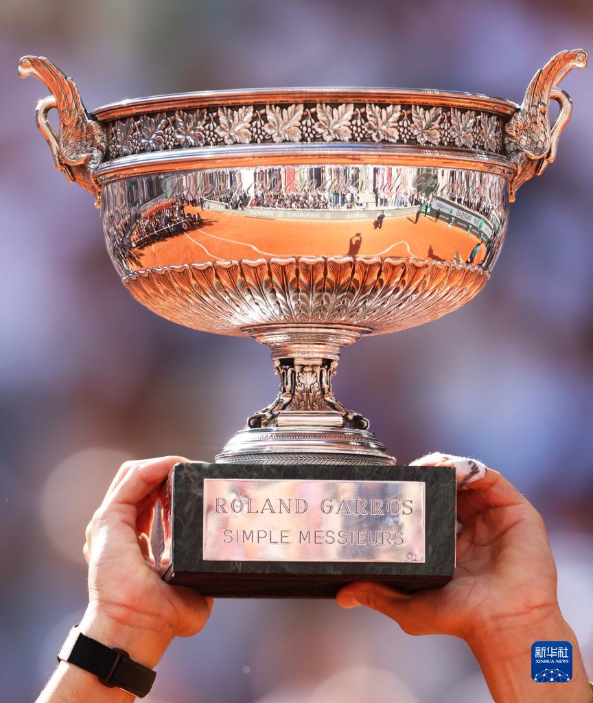 6月5日,納達(dá)爾在頒獎(jiǎng)儀式上舉起冠軍獎(jiǎng)杯。新華社記者 高靜 攝