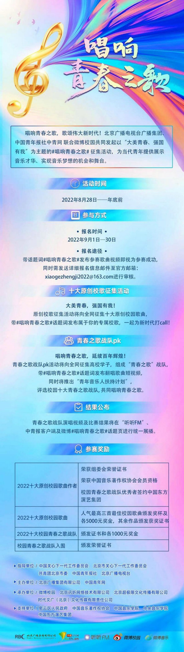 8月28日,首屆新時代校園歌曲征集展播活動暨校園青春之歌戰隊大賽啟動。活動由北京廣播集團與中國青年網主辦,以“大美青春、強國有我”為主題,通過微博話題#唱響青春之歌#,向全網征集原創校園歌曲。中國關心下一代工作委員會、北京市關心下一代工作委員會、共青團北京市委、中國青年報社、北京廣播電視臺具體指導活動開展。
