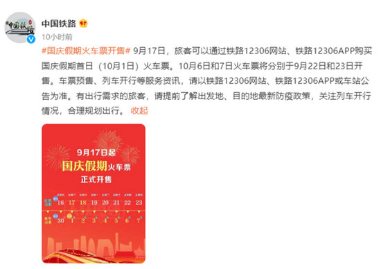 9月17日,旅客可以通過鐵路12306網(wǎng)站、鐵路12306APP購(gòu)買國(guó)慶假期首日(10月1日)火車票。10月6日和7日火車票將分別于9月22日和23日開售。車票預(yù)售、列車開行等服務(wù)資訊,請(qǐng)以鐵路12306網(wǎng)站、鐵路12306APP或車站公告為準(zhǔn)。有出行需求的旅客,請(qǐng)?zhí)崆傲私獬霭l(fā)地、目的地最新防疫政策,關(guān)注列車開行情況,合理規(guī)劃出行。
