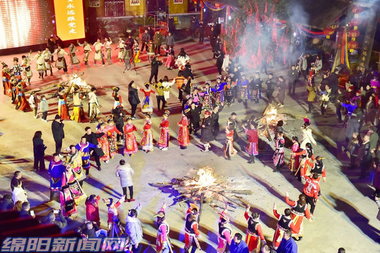 1月18日晚,身著民族盛裝的羌鄉兒女和游客一道牽手起舞,喜迎新春。