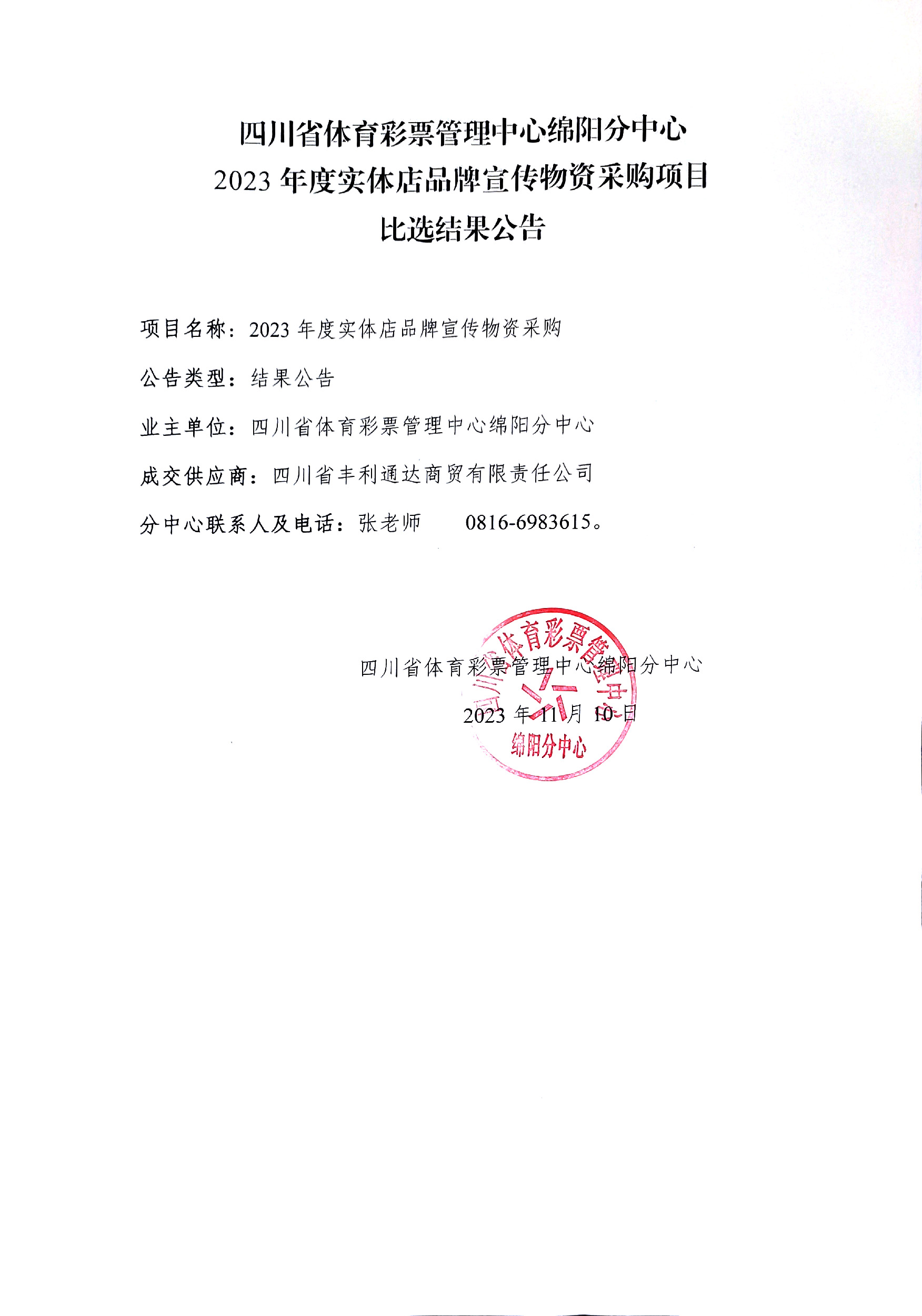 四川省體育彩票管理中心綿陽分中心 2023年度實(shí)體店品牌宣傳物資采購項目比選結(jié)果公告
