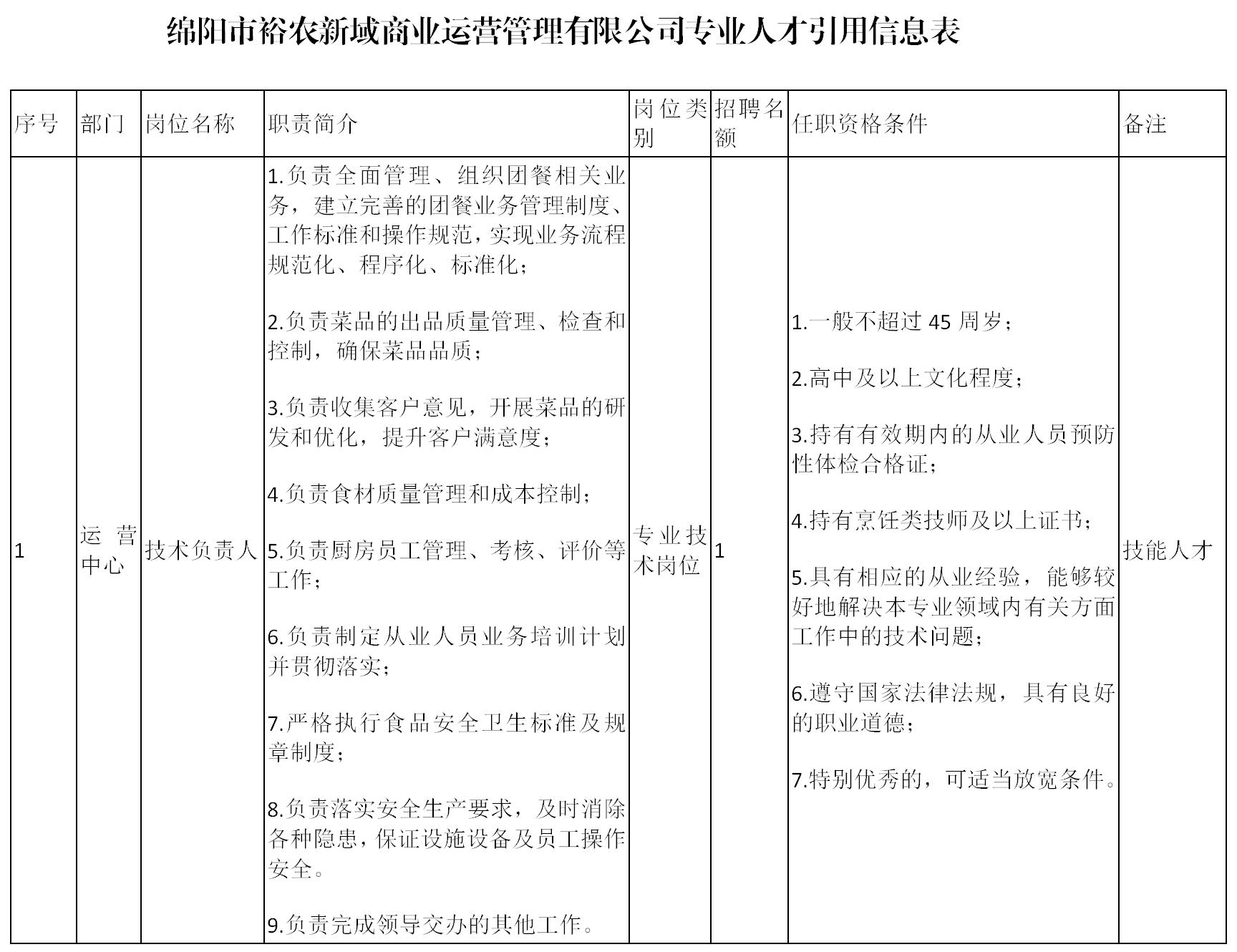 綿陽市裕農新域商業運營管理有限公司成立于2023年,為綿陽市高水農副產品批發有限公司下設的全資子公司,主要從事餐飲服務、城市配送運輸服務、商業綜合體管理服務等業務?,F因公司經營發展需要,經研究決定面向社會引進餐飲運營相關專業技術人才,現將有關事宜公告如下: