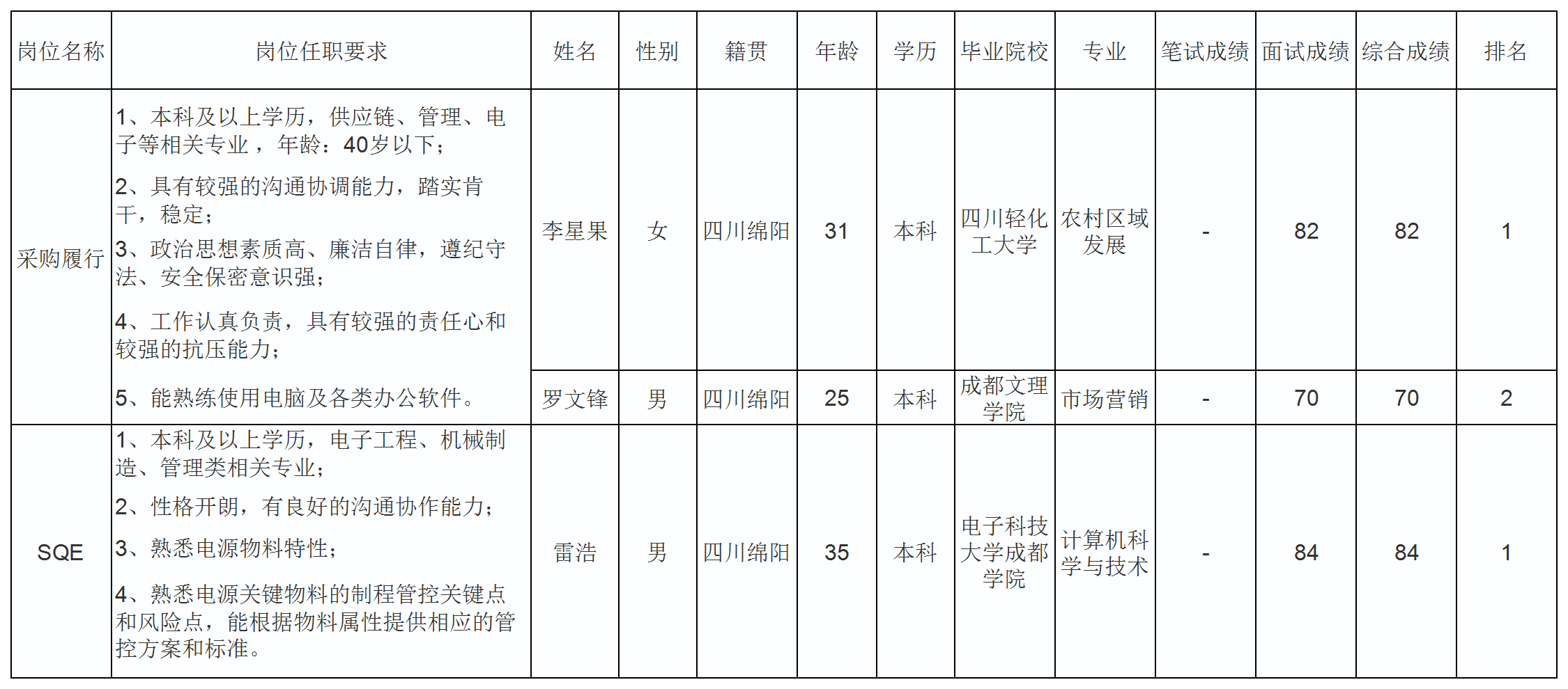 根據四川九州電子科技股份有限公司發布的招聘公告及招聘相關規定,經筆試、面試等程序,現將筆試(面試)成績予以公示。