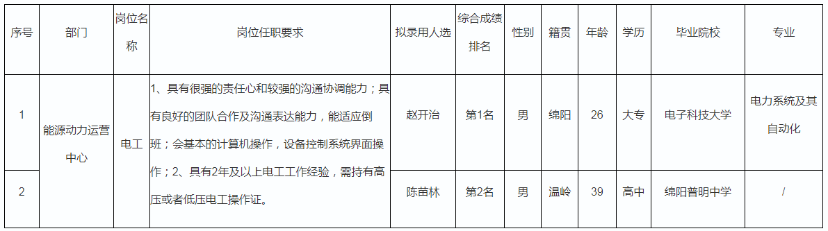 根據四川長虹電器股份有限公司發布的招聘公告及招聘相關規定,經筆試、面試、考察、體檢等程序,擬錄用趙開治等同志到能源動力運營中心工作,現予以公示,具體情況如下: