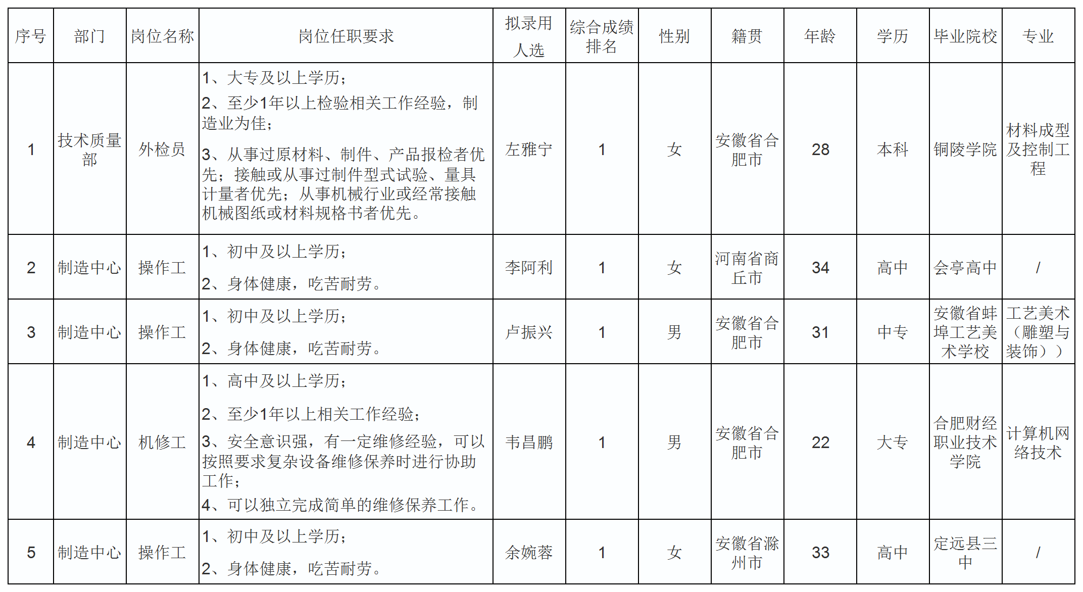 根據中科美菱低溫科技股份有限公司發布的招聘公告及招聘相關規定,經面試、考察、體檢等程序,擬錄用左雅寧等同志到技術質量部工作,現予以公示,具體情況如下: