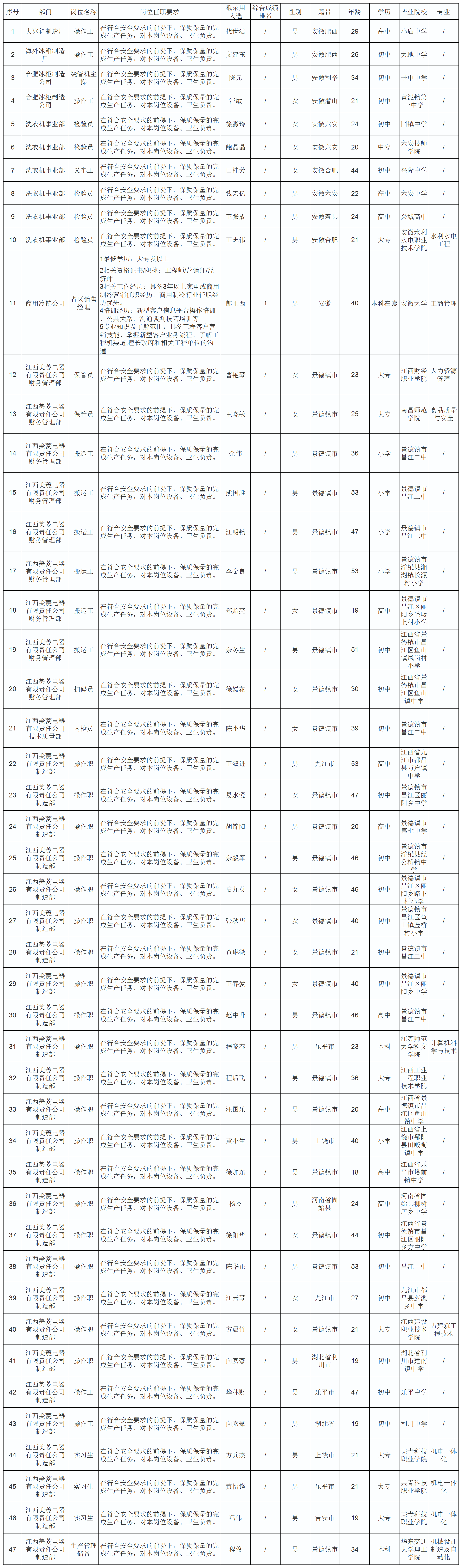根據(jù)長(zhǎng)虹美菱股份有限公司發(fā)布的招聘公告及招聘相關(guān)規(guī)定,經(jīng)面試、體檢等程序,擬錄用代世潔等47名同志到大冰箱制造廠等部門工作,現(xiàn)予以公示,具體情況如下: