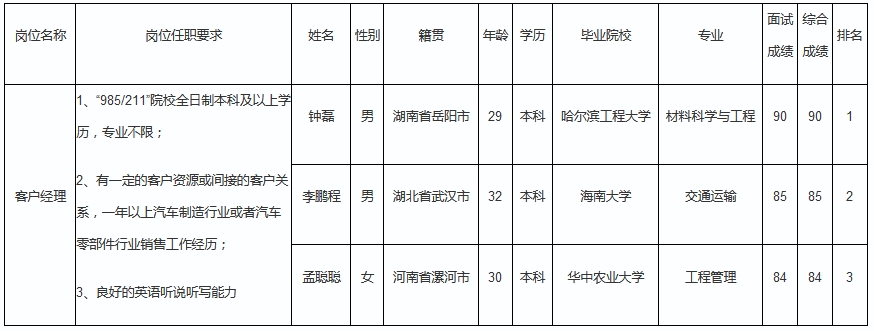 根據四川波鴻實業有限公司發布的招聘公告及招聘相關規定,經面試,現將威斯卡特工業(中國)有限公司客戶經理崗位成績予以公示。