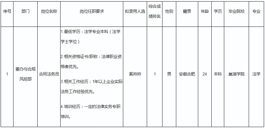 根據長虹美菱股份有限公司發布的招聘公告及招聘相關規定,經面試、體檢等程序,擬錄用奚帥帥同志到董辦與合規風控部門工作,現予以公示,具體情況如下: