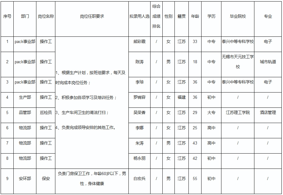 根據(jù)長虹三杰新能源有限公司發(fā)布的招聘公告及招聘相關(guān)規(guī)定,經(jīng)面試、體檢等程序,擬錄用以下同志到長虹三杰工作,現(xiàn)予以公示,具體情況如下: