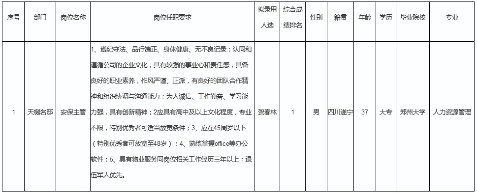 根據四川長虹物業服務有限責任公司成都分公司發布的招聘公告及招聘相關規定,經筆試、面試、考察、體檢等程序,擬錄用賀春林同志到天樾名邸管理處工作,現予以公示,具體情況如下: