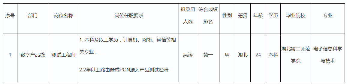 根據深圳市九洲電器有限公司發布的招聘公告及招聘相關規定,經筆試、面試、考察、體檢等程序,擬錄用吳濤同志到深圳市九洲電器有限公司工作,現予以公示,具體情況如下: