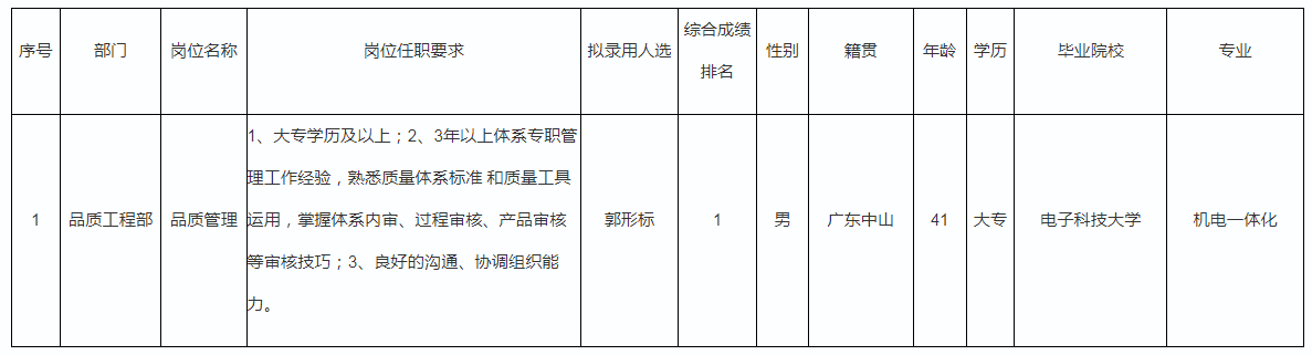 根據(jù)長虹模塑公司發(fā)布的招聘公告及招聘相關(guān)規(guī)定,經(jīng)筆試、面試、考察、體檢等程序,擬錄用郭形標同志到中山長虹模塑科技有限公司任職品質(zhì)管理工作,現(xiàn)予以公示,具體情況如下: