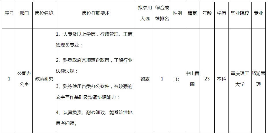 根據廣東長虹電子有限公司發布的招聘公告及招聘相關規定,經面試、考察、體檢等程序,擬錄用黎露同志到公司辦公室工作,現予以公示,具體情況如下: