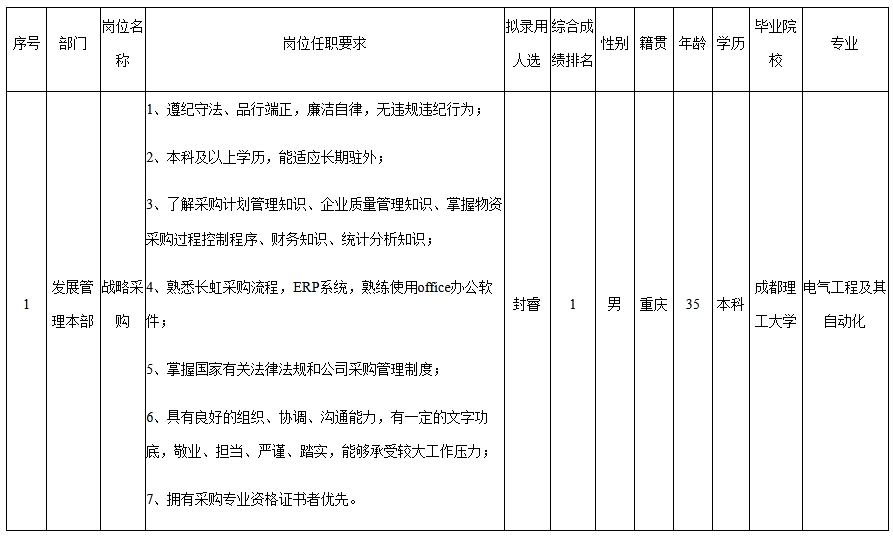根據四川長虹新能源科技股份有限公司發布的招聘公告及招聘相關規定,經面試、考察、體檢等程序,擬錄用封睿同志到四川長虹新能源科技股份有限公司工作,現予以公示,具體情況如下: