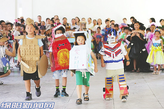 綿陽(yáng)新聞網(wǎng)訊 近日,一場(chǎng)“環(huán)保時(shí)裝秀”在綿陽(yáng)市南街小學(xué)習(xí)藝坊拉開帷幕,百余名學(xué)生在老師和家長(zhǎng)的協(xié)助下,發(fā)揮想象,用靈巧的雙手對(duì)塑料袋、紙殼、舊報(bào)紙、舊衣物等廢舊物品進(jìn)行分類設(shè)計(jì),改造成一件件獨(dú)具匠心的“時(shí)裝”,走出了一場(chǎng)別開生面的時(shí)尚大秀(如圖)。
