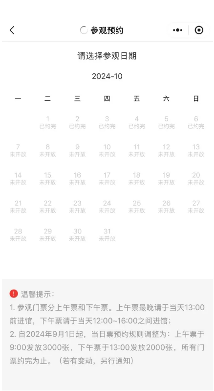 南京博物院國慶前6天的門票均已約完。南博工作人員介紹,國慶假期,南京博物院延時(shí)開放至21:00(20:00停止入館)。沒約到門票的,記得“蹲守”。國慶七天,南博每天9點(diǎn)、13點(diǎn)、17點(diǎn)將分別發(fā)放3000張、2000張、5000張當(dāng)日門票。