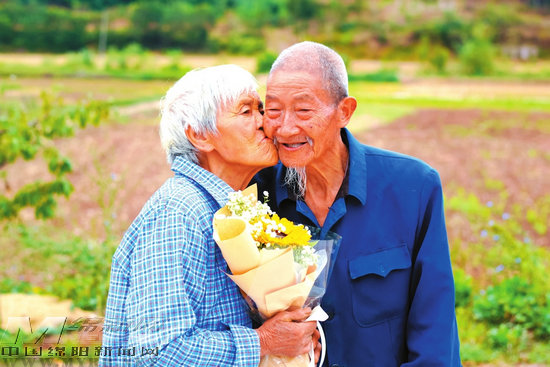 “婆婆爺爺,我?guī)湍銈冋硪幌乱路恼崭瘢?rdquo;記者來到百歲老人禹金安家中時,社工們正在為老人和他的妻子張庭秀老人整理衣服、梳妝打扮。“看鏡頭,茄子!”“咔嚓”一聲后,兩人幸福的笑臉定格在這一瞬間,記錄下了愛情最美的樣子。