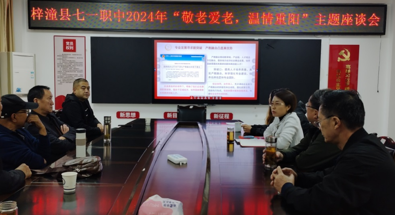 在重陽節(jié)之際,梓潼縣“七一”高級(jí)職業(yè)中學(xué)舉行了以“敬老愛老,溫情重陽”為主題的2024年重陽節(jié)座談會(huì)及系列活動(dòng),該校黨支部書記、校長梁金蓉、副校長王桂平、陳超等校領(lǐng)導(dǎo)同受邀請(qǐng)的退休老教師一道歡度重陽節(jié)。