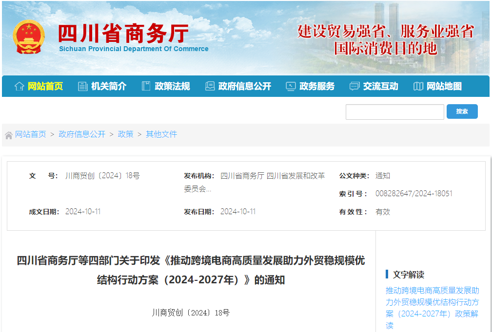 據(jù)四川省商務(wù)廳網(wǎng)站消息,四川省商務(wù)廳等四部門日前印發(fā)了《推動(dòng)跨境電商高質(zhì)量發(fā)展助力外貿(mào)穩(wěn)規(guī)模優(yōu)結(jié)構(gòu)行動(dòng)方案(2024-2027年)》,詳情如下:
