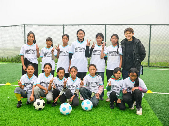 2024年6月19日,國家女足隊(duì)員王霜在涼山彝族自治州昭覺縣瓦吾小學(xué)與小女足隊(duì)員們合影。新華社記者 王曦 攝