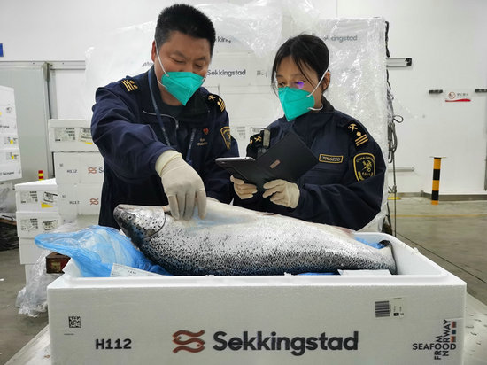 成都雙流機場海關關員對挪威三文魚實施現場監管作業。成都海關供圖