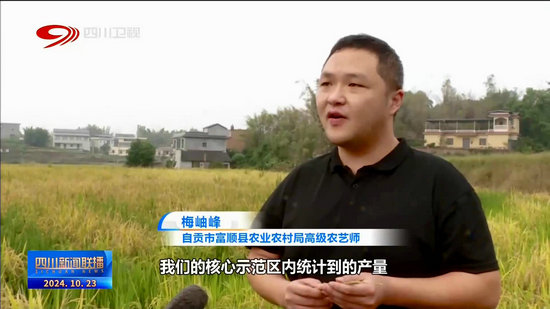 自貢市富順縣農業農村局高級農藝師 梅岫峰:我們的核心示范區內統計到的產量,(中稻畝產)達到了667公斤,再生稻測產(畝產)達到了403公斤,兩季畝產(量)突破了噸糧。