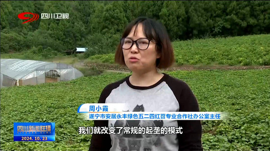 遂寧市安居永豐綠色五二四紅苕專業合作社辦公室主任 周小霞:我們就改變了常規的起壟的模式,我們現在用的是雙壟溝槽的模式,會比常規(方式種植的)商品薯增長25%——30%。