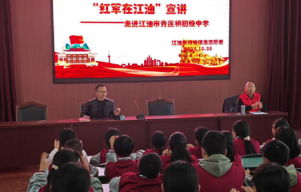 在紀念中國工農紅軍出發90周年之際,10月28 日下午,江油市青蓮鎮初級中學舉辦了以“宣講紅軍故事,汲取奮進力量”為主題的2024年秋“紅軍在江油”故事宣講會,原江油市扶貧局局長敖國民同志主講,江油市老干部服務中心副主任、關工委副主任張茂濤同志參加大會,副校長桂陽主持。
